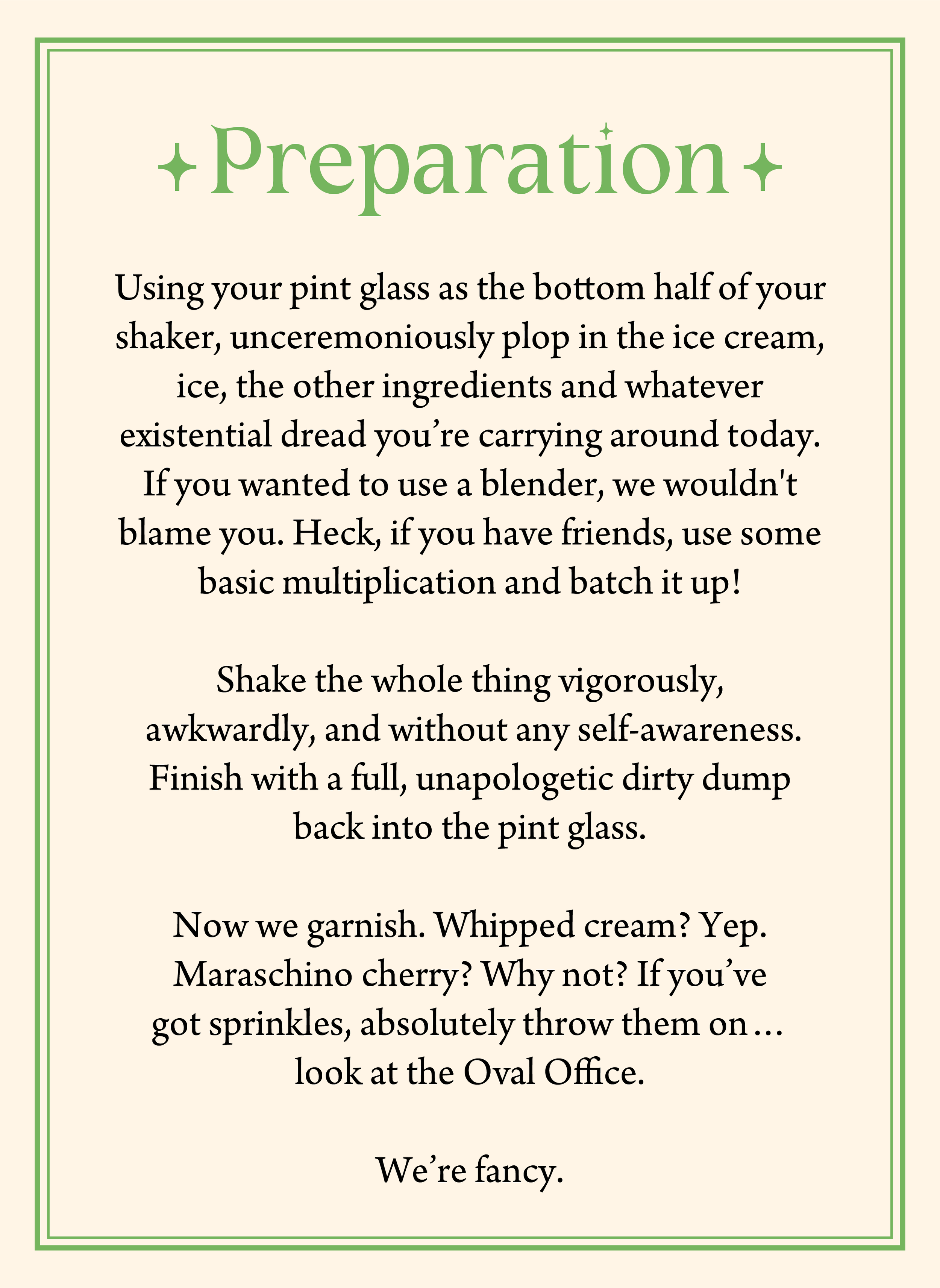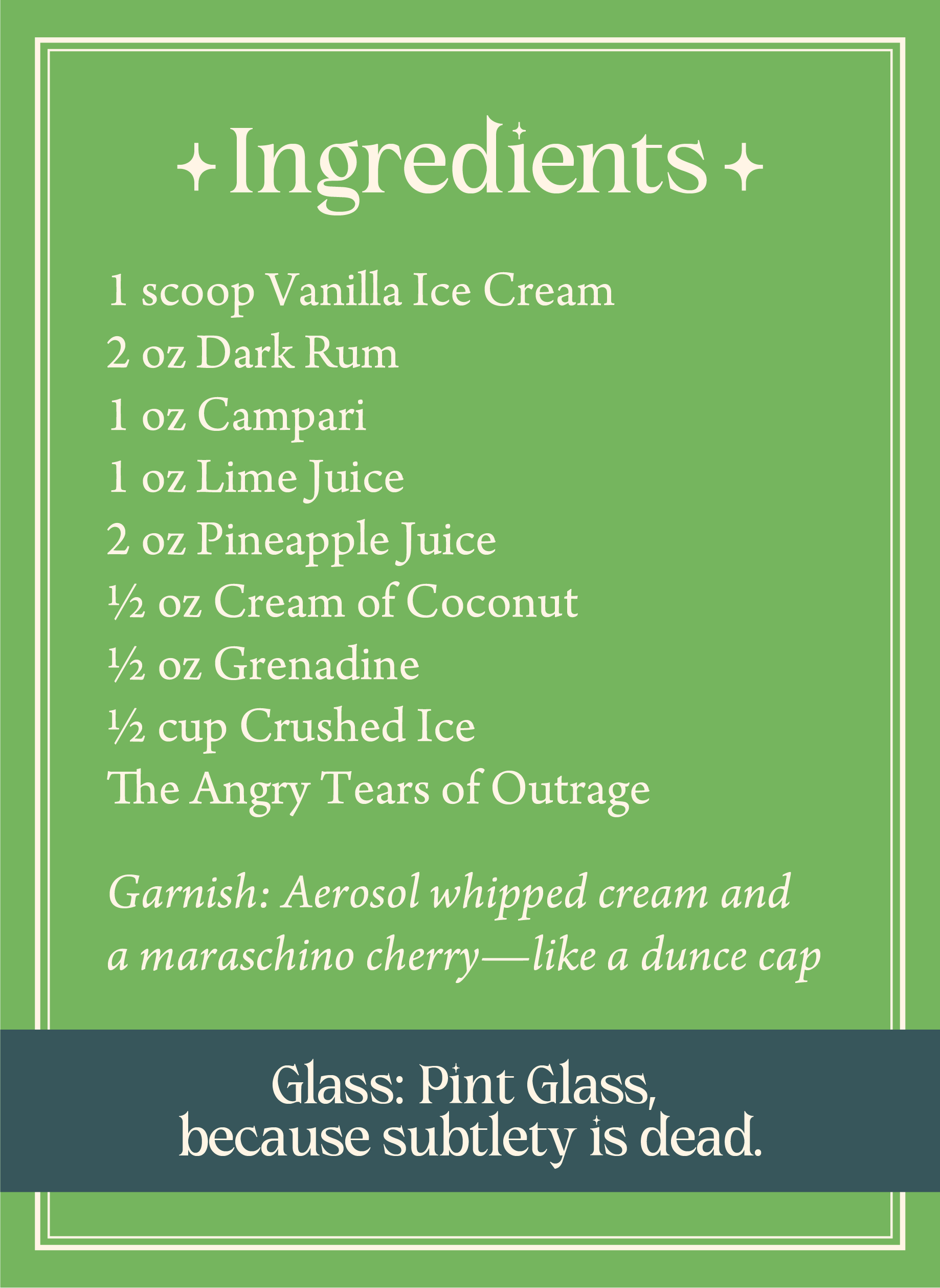 Vanilla Ice Cream ✦ Vodka ✦ Amaretto ✦ Dark Rum ✦ Grenadine ✦ Cherry Bitters ✦ Cream of Coconut ✦ The angry tears of outrage ✦